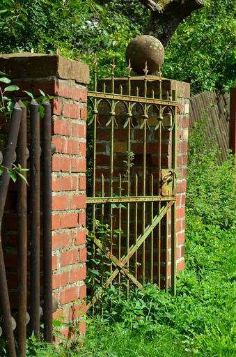 Keywords: garden door input garden gate goal eisentor door metal entry garden green post old stone overgrown weathered