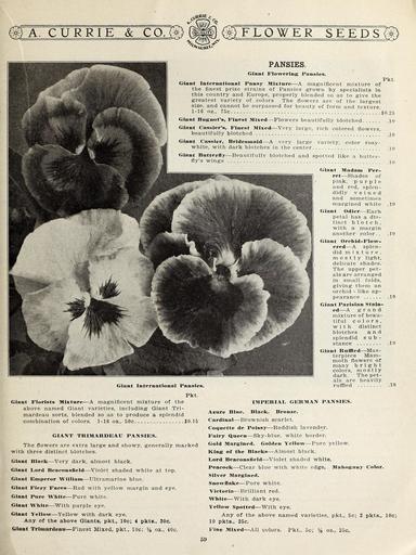 | Keywords: Garden and farm seeds (15815512704).jpg A CURRIE CO <br> viftRIE <br> FLOWER SEEDS <br> PANSIES <br> Giant Flowering Pansies <br> Pkt <br> Giant International Pansies <br> Pkt <br> Giant Florists Mixture A magnificent mixture of the <br> above named Giant varieties including Giant Tri- <br> mardeau sorts blended so as to produce a splendid <br> combination of colors 1-16 oz 50c 0 15 <br> GIANT TRIMARDEAU PANSIES <br> The flowers are extra large and showy generally marked <br> with three distinct blotches <br> Giant Black Very dark almost black <br> Giant Lord Beaconsfield Violet shaded white at top <br> Giant Emperor William Ultramarine blue <br> Giant Fiery Faces Red with yellow margin and eye <br> Giant Pure White Pure white <br> Giant White With purple eye <br> Giant Yellow Yellow with dark eye <br> Any of the above Giants pkt 10c; 4 pkts 30c <br> Giant Triumrdeau Finest Mixed pkt 10c; y 8 oz 40c <br> Giant International Pansy mixture A magnificent mixture of <br> the finest prize strains of Pansies grown by specialists in <br> this country and Europe properly blended so as to give the <br> greatest variety of colors The flowers are of the largest <br> size and cannot be surpassed for beauty of form and texture <br> 1-16 oz 75c ; 0 25 <br> Giant Bngnot's Finest Mixed Flowers beautifully blotched 10 <br> Giant Cassier's Finest Mixed Very large rich colored flowers <br> beautifully blotched jq <br> Giant Cassier Bridesmaid A very large variety color rosy- <br> white with dark blotches in the center io <br> Giant Butterfly Beautifully blotched and spotted like a butter- <br> fly's wings \ io <br> Giant Madam Fer- <br> ret Shades of <br> pink purple <br> and red splen- <br> didly veined <br> and sometimes <br> margined white 10 <br> Giant Odier Each <br> petal has a dis- <br> tinct blotch <br> with a margin <br> another color 10 <br> Giant Orch id-Flo w- <br> ered A splen- <br> did mixture <br> mostly light <br> delicate shades <br> The upper pet- <br> als are arranged <br> in small folds <br> giving them an <br> orchid - like ap- <br> pearance 10 <br> Giant Parisian Stain- <br> ed A grand <br> mixture of beau- <br> tiful colors <br> with distinct <br> blotches and <br> splendid sub- <br> stance 10 <br> Giant Ruffled Mas- <br> terpiece Mam- <br> moth flowers of <br> many bright <br> colors mostly <br> dark The pet- <br> als are heavily <br> ruffled 10 <br> I31PERIAL GERMAN PANSIES <br> Azure Blue Black Bronze <br> Cardinal Brownish scarlet <br> Coquette de Poissy Reddish lavender <br> Fairy Queen Sky-blue white border <br> Gold Margined Golden Yellow Pure yellow <br> King of the Blacks Almost black <br> Lord Beaconsfield Violet shaded white <br> Peacock Clear blue with white edge Mahogany Color <br> Silver Margined <br> Snowflake Pure white <br> Victoria Brilliant red <br> White With dark eye <br> Yellow Spotted With eye <br> Any of the above named varieties pkt 5c; 3 pkts 10c; <br> 10 pkts 25c <br> Fine Mixed All colors <br> Pkt 5c; Vs oz 25c <br> 5D 42156385 132760 65915 Page 59 Text http //www biodiversitylibrary org/page/42156385 1913 10 5962/bhl title 65915 A Currie Company ; Henry G Gilbert Nursery and Seed Trade Catalog Collection Biodiversity Heritage Library Garden and farm seeds spring 1913 um Garden Stories Bulbs Plants Catalogs Equipment and supplies Flowers Gardening Nurseries Horticulture Plants Ornamental Seeds Vegetables U S Department of Agriculture National Agricultural Library bhl page 42156385 dc identifier http //biodiversitylibrary org/page/42156385 bhlGardenStories Pansys A Currie Co BHLinbloom bulbs plants nurseries horticulture plants ornamental u s department of agriculture national agricultural library bhlgardenstories a currie co bhlinbloom Information field Flickr posted date ISOdate 2015-02-03 Check categories 2015 August 25 CC-BY-2 0 BioDivLibrary https //flickr com/photos/61021753 N02/15815512704 2015-08-25 01 50 26 cc-by-2 0 PD-old-70-1923 Garden and farm seeds 1913 Photos uploaded from Flickr by FĂŚ using a script |