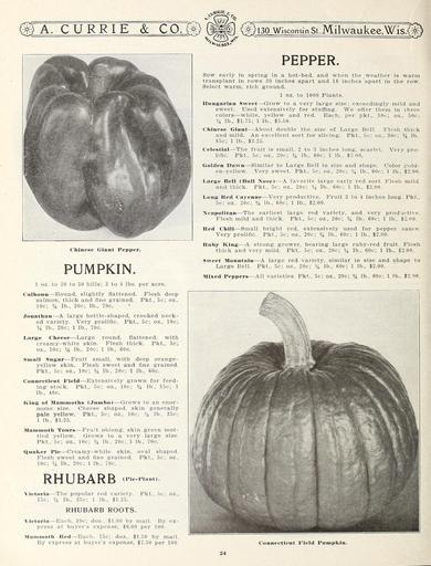 Keywords: Garden and farm seeds (16185034398).jpg c yg£j£ <br> A CURRIE CO <br> fl£ J 130 Wisconsin St Milw aukee Wis £ £ <br> PEPPER <br> Chinese Giant Pepper <br> PUMPKIN <br> 1 oz to 30 to 50 hills; 3 to 4 lbs per acre <br> Calhoun ” Round slightly flattened Flesh deep <br> salmon thick and fine grained Pkt 5c; oz <br> 10c; Vi lb 20c; lb 70c <br> Jonathan ” A large bottle-shaped crooked neck- <br> ed variety Very prolific Pkt 5c; oz 10c; <br> Vi lb 20c; 1 lb 70c <br> Large Cheese ” Large round flattened 'with <br> creamy-white skin Flesh thick Pkt 5c; <br> oz 10c; lb 20c; 1 lb 60c <br> Small Sugar ” Fruit small with deep orange- <br> yellow skin Flesh sweet and fine grained <br> Pkt 5c; oz 10c; lb 20c; 1 lb 60c <br> Connecticut Field ” Extensively grown for feed- <br> ing stock Pkt 5c; oz 10c; lb 15c; 1 <br> lb 40c <br> King of Mammoths Jumbo ” Grows to an enor- <br> mous size Cheese shaped skin generally <br> pale yellow Pkt 5c; oz 10c; 14 lb 35c; <br> 1 lb 1 25 <br> Mammoth Tours ” Fruit oblong skin green mot- <br> tled yellow Grows to a very large size <br> Pkt 5c; oz 10c; Vi lb 20c; 1 lb 70c <br> Quaker Pie ” Creamy-white skin oval shaped <br> Flesh sweet and fine grained Pkt 5c; oz <br> 10c; 14 lb 20c; 1 lb 70c <br> RHUBARB c <br> ie-Plaut <br> Pkt 5c; oz <br> Victoria ” The popular red variety <br> 15c; Vi lb 35c; 1 lb 1-25 <br> RHUBARB ROOTS <br> Victoria ” Each 10c; doz 1 00 by mail By ex- <br> press at buyer's expense 6 00 per 100 <br> Mammoth Red ” Each 15c; doz 1 50 by mail <br> By express at buyer's expense 7 50 per 100 <br> Sow early in spring in a hot-bed and when the weather is warm <br> transplant in rows 30 inches apart and 18 inches apart in the row <br> Select warm rich ground <br> 1 oz to 1000 Plants <br> Hungarian Sweet ” Grow to a very large size; exceedingly mild and <br> sweet Used extensively for stuffing We offer them in three <br> colors ” -white yellow and red Each per pkt 10c; oz 50c; <br> lb 1 75; 1 lb 5 50 <br> Chinese Giant ” About double the size of Large Bell Flesh thick <br> and mild An excellent sort for slicing Pkt 5c; oz 30c; lb <br> 85c; 1 lb 3 25 <br> Celestial ” The fruit is small 2 to 3 inches long scarlet Very pro- <br> lific Pkt 5c; oz 20c; lb 60c; 1 lb 2 00 <br> Golden Dawn ” Similar to Large Bell in size and shape Color £old- <br> en-yellow Very sweet Pkt 5c; oz 20c; 14 lb 60c; 1 lb 2 00 <br> Large Bell Bull Nose ” A favorite large early red sort Flesh mild <br> and thick Pkt 5c; oz 20c; lb 60c; 1 lb 2 00 <br> Long Red Cayenne ” Very productive Fruit 3 to 4 inches long Pkt <br> 5c; oz 20c; 14 lb 60c; 1 lb 2 00 <br> Neapolitan ” The earliest large red variety and very productive <br> Flesh mild and thick Pkt 5c; oz 20c; lb 60c; 1 lb 2 00 <br> Red Chili ” Small bright red extensively used for pepper sauce <br> Very prolific Pkt 5c; oz 20c; lb 60c; 1 lb 2 00 <br> Ruby King ” A strong grower bearing large ruby-red fruit Flesh <br> thick and very mild Pkt 5c; oz 20c; lb 60c; 1 lb 2 00 <br> Sweet Mountain ” A large red variety similar in size and shape to <br> Large Bell Pkt 5c; oz 20c; 14 lb 60c; 1 lb 2 00 <br> Mixed Peppers ” All varieties Pkt 5c; oz 20c; lb 60c; 1 lb 2 00 <br> Connecticut Field Pumpkin <br> 24 42156476 132761 65916 Page 24 Text http //www biodiversitylibrary org/page/42156476 1912 10 5962/bhl title 65916 A Currie Company ; Henry G Gilbert Nursery and Seed Trade Catalog Collection Biodiversity Heritage Library Garden and farm seeds spring 1912 Garden Stories Bulbs Plants Catalogs Equipment and supplies Flowers Gardening Nurseries Horticulture Plants Ornamental Seeds Vegetables U S Department of Agriculture National Agricultural Library bhl page 42156476 dc identifier http //biodiversitylibrary org/page/42156476 bhlGardenStories BHLinbloom bulbs plants nurseries horticulture plants ornamental u s department of agriculture national agricultural library bhlgardenstories bhlinbloom Information field Flickr posted date ISOdate 2015-01-26 Check categories 2015 August 25 CC-BY-2 0 BioDivLibrary https //flickr com/photos/61021753 N02/16185034398 2015-08-25 06 52 22 cc-by-2 0 PD-old-70-1923 Garden and farm seeds 1912 Photos uploaded from Flickr by Fæ using a script