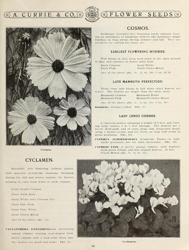 | Keywords: Garden and farm seeds (16186503119).jpg  A CURRIE COM <br> FLOWER SEEDSi <br> Cosmos <br> COSMOS <br> Strikingly beautiful free blooming' hardy annuals bear- <br> ing' an abundance of handsome flowers like miniature single <br> Dahlias on long stems during summer and fall They are <br> excellent for cutting for vases etc <br> EARLIEST FLOWERING HYBIRDS <br> Will bloom in July from seed sown in the open ground <br> in May and continue in flower until frost <br> Early Crimson Early White <br> Early Pink Early Choice Mixed <br> Any of the above pltt 5c; V-t oz 50c; 1 oz 1 50 <br> LATE MAMMOTH PERFECTION <br> These come into bloom in fall when other flowers are <br> scarce The flowers are larger than the early sorts <br> Mammoth Crimson Mammoth White <br> Mammoth Pink Mammoth Choice Mixed <br> vVny of the above pkt 5c; oz 15c; 1 oz 50e <br> Ivlonilvkt- ” Orange-yellow Pkt 5c <br> LADY LENOX COSMOS <br> A vigorous grower attaining a height of 6 feet and form- <br> ing large bushes 4 to 5 feet through The flowers are a <br> lovely shell-pink and of extra large size frequently meas- <br> uring 4 inches across and are borne on long stiff stems in <br> great profusion Pkt 10c <br> CYPERUS ALiTERNIFOliItrS Umbrella Plant ” A half- <br> hardy perennial fine for table decoration Pkt 10c <br> CYPRESS VINE ” A pretty annual climber with feathery <br> dark green foliage and star-shaped flowers 20 feet <br> Finest Mixed pkt 5c; oz 15c <br> CYCLAMEN <br> Beautiful free flowering bulbous plants <br> with graceful orchid-like blossoms blooming <br> during the fall and winter months the flowers <br> ranging in color from white to dark crimson <br> Giant Bright Crimson <br> Giant Dark Rose <br> Giant White with Crimson Eye <br> Giant Pale Pink <br> Giant Pure White <br> Giant Finest Mixed <br> Any of the above pkt 15c <br> CYCLAXTHERA EXIM ODENS ” An interesting <br> annual climber bearing oval-shaped fruit <br> which explode with a loud noise when ripe <br> The flowers are small and white Pkt 5c <br> ' ' <br> » w <br> / »i <br> <br> Cyclamen 42156505 132761 65916 Page 53 Text http //www biodiversitylibrary org/page/42156505 1912 10 5962/bhl title 65916 A Currie Company ; Henry G Gilbert Nursery and Seed Trade Catalog Collection NameFound Cyperus NameConfirmed Cyperus EOLID 29130 NameBankID 2576446 Biodiversity Heritage Library Garden and farm seeds spring 1912 Garden Stories Bulbs Plants Catalogs Equipment and supplies Flowers Gardening Nurseries Horticulture Plants Ornamental Seeds Vegetables U S Department of Agriculture National Agricultural Library bhl page 42156505 dc identifier http //biodiversitylibrary org/page/42156505 bhlGardenStories BHLinbloom bulbs plants nurseries horticulture plants ornamental u s department of agriculture national agricultural library bhlgardenstories bhlinbloom Information field Flickr posted date ISOdate 2015-01-26 Check categories 2015 August 25 CC-BY-2 0 BioDivLibrary https //flickr com/photos/61021753 N02/16186503119 2015-08-25 06 52 52 cc-by-2 0 PD-old-70-1923 Garden and farm seeds 1912 Photos uploaded from Flickr by Fæ using a script |