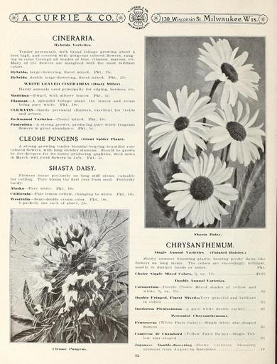 | Keywords: Garden and farm seeds (16370996751).jpg c»«E L« <br> A CURRIE CO m I <br> 130 Wisconsi n St Milwaukee W <br> CINERARIA <br> Hybrida Varieties <br> Tender perennials with broad foliage growing' about a <br> foot high and covered with gorgeous colored flowers rang- <br> ing in color through all shades of blue crimson maroon etc <br> Many of the flowers are margined with the most brilliant <br> colors <br> Hybrida large-flowering finest mixed Pkt 15c <br> Hyliridn double large-flowering finest mixed Pkt 25c <br> WHITE LEAVED CINERARIAS Dusty Miller <br> Hardy annuals used principally for edging borders etc <br> Maritiina ” Dwarf with silvery leaves Pkt 5c <br> Diamaiit ” A splendid foliage plant the leaves and stems <br> being pure white Pkt 10c <br> CLEMATIS ” Hardy perennial climbers excellent for trellis <br> and arbors <br> Jackinanni Varieties ” Choice mixed Pkt 10c <br> I'auieulnta ” A strong grower producing pure white fragrant <br> flowers in great abundance Pkt 5c <br> CLEOME PUNGENS «t Spider Plaut <br> A strong growing tender biennial bearing beautiful rose <br> colored flowers with long slender stamens Should be grown <br> by bee-keepers for its honey-producing qualities Seed sown <br> in March will yield flowers in July PKt 5c <br> SHASTA DAISY <br> Flowers borne profusely on long stiff stems valuable <br> for cutting They bloom the first year from seed Perfectly <br> hardy <br> Alaska ” Pure white Pkt 10c <br> California ” Pale lemon-yellow changing to white Pkt 10c <br> Westralia ” Semi-double cream color Pkt 10c <br> 3 packets one each of above 25c <br> Cleonie l iiii eiis <br> Shasta Daisy <br> CHRYSANTHEMUM <br> Single Annual Varieties Painted Daisies <br> Showy summer blooming plants bearing pretty daisy-like <br> flowers on long stems The colors are exceedingly brilliant <br> mostly in distinct bands or zones Pkt <br> Choice Sin isle Mixed Colors oz 15c 0 05 <br> Double Annual Varieties <br> Coronariiini ” Double Choice Mixed shades of yellow and <br> white Vz oz 15c 05 <br> Double Fringed Fines Mixed ” Very graceful and brilliant <br> in colors 05 <br> Iuodoruiu Plenissimuin ” A pure white double variety 05 <br> Perennia 1 Ch rysa n I hem u ins <br> Friiteseens White Paris Daisy ” Single white star-shaped <br> flowers 05 <br> iiules se de Cliumbord Yellow Paris Da' sy ” Single Yel- <br> low star-shaped 05 <br> Japanese Doublc-llotvcring ” Showy varieties blooming; <br> outdoors from August to November 10 42156504 132761 65916 Page 52 Text http //www biodiversitylibrary org/page/42156504 1912 10 5962/bhl title 65916 A Currie Company ; Henry G Gilbert Nursery and Seed Trade Catalog Collection NameFound Chrysanthemum NameConfirmed Chrysanthemum EOLID 38388 NameBankID 2657422 NameFound CINERARIA NameConfirmed Cineraria EOLID 6258313 NameBankID 1674869 NameFound CINERARIA NameConfirmed Cineraria EOLID 6258313 NameBankID 4894724 NameFound CLEMATIS NameConfirmed Clematis ser Alpina W J Yang L Qian Li EOLID 38289 NameFound Cleome pungens NameConfirmed Cleome pungens auct non Willd EOLID 488261 NameBankID 606278 NameFound Coronariiini NameFound Hybrida NameConfirmed Hybrida NameBankID 5327990 NameFound Maritiina Biodiversity Heritage Library Garden and farm seeds spring 1912 Garden Stories Bulbs Plants Catalogs Equipment and supplies Flowers Gardening Nurseries Horticulture Plants Ornamental Seeds Vegetables U S Department of Agriculture National Agricultural Library bhl page 42156504 dc identifier http //biodiversitylibrary org/page/42156504 bhlGardenStories BHLinbloom bulbs plants nurseries horticulture plants ornamental u s department of agriculture national agricultural library bhlgardenstories bhlinbloom Information field Flickr posted date ISOdate 2015-01-26 Check categories 2015 August 25 CC-BY-2 0 BioDivLibrary https //flickr com/photos/61021753 N02/16370996751 2015-08-25 06 53 34 cc-by-2 0 PD-old-70-1923 Garden and farm seeds 1912 Photos uploaded from Flickr by Fæ using a script |