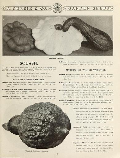 Keywords: Garden and farm seeds (16371789412).jpg 2l <br> A CURRI E CO gt O GARD EN SEE j <br> Summer Squash <br> SQUASH <br> Plant the Bush varieties in hills 5 to 6 feet apart and <br> the Marrow sorts 9 to 10 feet apart Plant in rich warm soil <br> and thin to three plants to the hill <br> Bush Squash 1 oz to 50 hills; 5 lbs to the acre <br> Marrow Squash 1 oz to 20 hills; 4 lbs to the acre <br> BUSH OR SUMMER SQUASH <br> Giant Crookneek A popular extra early sort Color golden- <br> yellow heavily warted Pkt 5c; oz 10c; lb 20c; <br> 1 lb 70c <br> Mammoth White Bush Scalloped An early white variety <br> with large thick heavily scalloped fruit Pkt 5c; oz <br> 10c; lb 20c; 1 lb 70c <br> Golden Custard An early variety Color golden-yellow <br> heavily scalloped Pkt 5c; oz 10c; lb 20c; 1 lb 70c <br> Delieata A small early vine variety Flesh solid with a <br> small seed cavity Pkt 5c; oz 10c; lb 25c; 1 lb 70c <br> MARROW OR WINTER VARIETIES <br> Boston Marrow Grows to a large size with bright orange <br> skin and deep orange flesh Pkt 5c; oz 10c; lb 20c; <br> 1 lb 70c <br> Delicious A splendid medium-sized variety with thick <br> dark orange flesh of very fine quality A splendid <br> keeper Pkt 5c; oz 10c; lb 25c; 1 lb 85c <br> Hubbard Grown more extensively than any other It is a <br> vigorous grower fruits large with deep green skin <br> Flesh rich golden fine grained dry and of excellent fla- <br> vor Pkt 5c; oz 10c; Yi lb 30c; 1 lb 1 00 <br> Warted Hubbard Similar to the preceding except that it is <br> more heavily warted It is an excellent keeper Pkt <br> 5c; oz 10c; lb 30c; 1 lb 1 00 <br> Golden Hubbard Possesses all the excel- <br> lent qualities of the Green Hubbard and <br> the same in all respects except that the <br> skin is deep orange The flesh is a deep <br> salmon color and of splendid flavor Pkt <br> 5c; oz 10c; lb 30c; 1 lb 1 00 <br> Mammoth Chili A very large variety at- <br> tractive in appearance The skin is <br> smooth color orange Flesh yellow thick <br> and of fine flavor Pkt 5c; oz 10c; <br> lb 30c; 1 lb 1 00 <br> Warted Hubbard Squash <br> Vegetable Marrow An English variety with <br> oblong fruit of a greenish white color <br> Flesh soft white and of rich flavor Pkt <br> 5c; oz 10c; lb 25c; 1 lb 75c <br> 27 42156479 132761 65916 Page 27 Text http //www biodiversitylibrary org/page/42156479 1912 10 5962/bhl title 65916 A Currie Company ; Henry G Gilbert Nursery and Seed Trade Catalog Collection Biodiversity Heritage Library Garden and farm seeds spring 1912 Garden Stories Bulbs Plants Catalogs Equipment and supplies Flowers Gardening Nurseries Horticulture Plants Ornamental Seeds Vegetables U S Department of Agriculture National Agricultural Library bhl page 42156479 dc identifier http //biodiversitylibrary org/page/42156479 bhlGardenStories BHLinbloom bulbs plants nurseries horticulture plants ornamental u s department of agriculture national agricultural library bhlgardenstories bhlinbloom Information field Flickr posted date ISOdate 2015-01-26 Check categories 2015 August 25 CC-BY-2 0 BioDivLibrary https //flickr com/photos/61021753 N02/16371789412 2015-08-25 06 54 30 cc-by-2 0 PD-old-70-1923 Garden and farm seeds 1912 Photos uploaded from Flickr by FĂŚ using a script |
