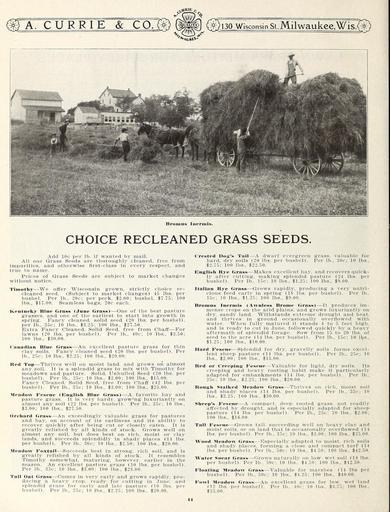 MAKE A MEME View Large Image Garden and farm seeds (16371818562).jpg c» E L« <br> A CURRIE COT fig m 1 30 Wisconsin St Milwaukee WJS £ <br> mus incriii <br> CHOICE RECLEANED GRASS SEEDS <br> Add 10c per lb if wanted by mail <br> All our Grass Seeds are thoroughly ...