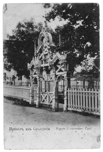 | Keywords: Garden Gate Sosnowski in Smolensk.jpg en Garden Gate Sosnowski now - Pioneer Park in Smolensk ru Во ота Сосновского сада ныне - Па к Пионе ов в Смоленске О игинальная отк ытка е установлены before 1917 года PD-RusEmpire 20th-century postcards of Russia Postcards of Smolensk |