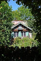 Keywords: garden shed log cabin romantic old mood garden nature building hidden picturesque trees sun light atmosphere