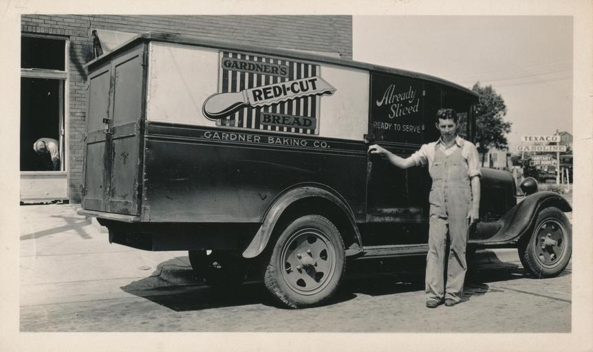| Keywords: Gardner Baking Company Delivery Truck 1931 Source: O'Dea Family Archive Date: 1931 A man stands next to a Gardner's Bakery delivery truck, which is parked in front of Plaenert's Grocery Store at 1128 S. Park St. The sign on the truck advertises a recent innovation, their Redi-Cut pre-sliced bread. Large signs for the Texaco Gas Station down the street can be seen on the right side of the picture. Gardner Baking Company Delivery Truck 1931 Source: O'Dea Family Archive Date: 1931 A man stands next to a Gardner's Bakery delivery truck, which is parked in front of Plaenert's Grocery Store at 1128 S. Park St. The sign on the truck advertises a recent innovation, their Redi-Cut pre-sliced bread. Large signs for the Texaco Gas Station down the street can be seen on the right side of the picture. |