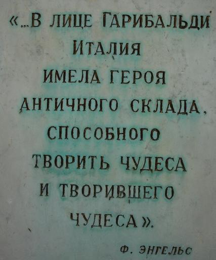 Keywords: Garibaldi Taganrog Plaque 1.jpg en Memorial plaque on Giuseppe Garibaldi's monument in Taganrog featuring a quotation from Friedrich Engels own ISasha ISasha Taganrog Plaques to Giuseppe Garibaldi Monuments and memorials in Taganrog Quotations Friedrich Engels |