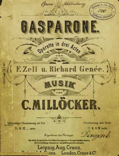 Keywords: Gasparone-Libretto-1885.jpg Gasparone Libretto cover http //digital bib-bvb de/webclient/DeliveryManager custom_att_2 simple_viewer pid 2941451 1885 Unknown artist Librettos operetta Karl Millöcker PD-old