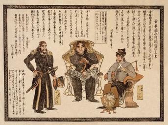 | Keywords: Gasshukoku suishi teitoku kōjōgaki (Oral statement by the American Navy admiral).png Assessments c 2009 1 1 Gasshukoku suishi teitoku kōjōgaki Oral statement by the American Navy admiral 1 1 24 Gasshukoku suishi teitoku kōjōgaki Oral statement by the American Navy admiral A Japanese print showing three men believed to be Commander Anan age 54; Perry age 49; and Captain Henry Adams age 59 who opened up Japan to the west The text being read may be President Fillmore's letter to Emperor of Japan This is a somewhat extensive restoration meant to keep focus on the artwork instead of the damage See also File Gasshukoku suishi teitoku kōjōgaki Oral statement by the American Navy admiral minimal restoration png Gasshukoku suishi teitoku kōjōgaki Déclaration orale par l'amiral de la marine américaine Estampe japonaise montrant trois hommes considérés comme étant les commandants Anan 54 ans ; Perry 49 ans ; et le capitaine Henry Adams 59 ans qui ont forcé le Japon à s'ouvrir à l'ouest Le texte lu est probablement la lettre du président Fillmore à l'empereur du Japon La restauration de cette estamps est assez importante permettant de se concentrer sur l'art plus que sur les dégâts subits par l'œuvre A comparer avec cette version à restauration minimale Vertrag von Kanagawa Commodore Matthew Perry Mitte und andere hochrangige US-Seeleute Japanischer Farbholzschnitt Xilografía japonesa con Perry al centro y otros altos oficiales de la marina de EE UU Amerikako Armadako almirantearen ahozko adierazpena 1854 ingurukoa Ezkerretik eskuinera Anan komandantea Perry komodoroa eta Henry Adams kapitaina Japonia Mendebaldeari ateak irekitzera behartu zuen ekitaldian חיתוך עץ יפני ש אנשי הצי האמריקאיי ופרי במרכז cph 3g10708 Library of Congress ca 1854 author The Library of Congress says No known restrictions on publication File Gasshukoku suishi teitoku kōjōgaki Oral statement by the American Navy admiral minimal restoration png - The most accurate version to how it looks now - scanning errors corrected using a colourbox and the masking tape stuck to it edited out but none of the cleanup from this version File Gasshukoku suishi teitoku kōjōgaki Oral statement by the American Navy admiral unrestored png - Completely unrestored Should never be used anywhere as the colours as shown in the colour box the LOC included in the scan are obviously wrong Levels adjusted using LoC colourbox dirt and stains cloned out or selectively adjusted and cropped from LoC version PD-100 PD-Japan Ukiyo-e of historical figures and folk tales Matthew Perry naval officer 31 March Documents of Japan Featured pictures of Japan Perry Expedition 1853 Perry Expedition in art Woodblock prints of the Edo period Captain Henry Adams Yokohama-e Kurihama Yokosuka History of Yokosuka Featured pictures from the Library of Congress |