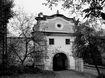 Keywords: gate trees black and white city path slovakia