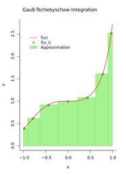 | Keywords: Gauss-chebychev-integration.svg Gauß-Chebychev-Integration/quadrature de Beispiel für Gauß-Tschebyschow-Integration/Quadraturhttp //de wikipedia org/wiki/Gau C3 9F-Quadratur Gau C3 9F-Tschebyschow-Integration own Accountalive 2011-05-02 Created with w R-Project using the following code <source lang R> f <- function x exp x 3 n 7 xi cos 2 n 1 -1 / 2 n pi w pi/n width w sqrt 1-xi 2 sum width f xi print approximated integral plot axis and labels range -100 100 /100 maxx sum width /2 plot range f range xlim 1 05 c -1 maxx maxx ylim c 0 01045 max f range type n col 2 bty l main Gauß-Tschebyschow-Integration\nn 7 xlab x ylab y height f xi recangles may start at < -1 curx -sum width /2 plot green boxes for i in 1 n y c 0 heighti heighti 0 x c curx curx curx+widthi curx+widthi polygon x y density -1 border hsv 0 3 0 4 0 8 col hsv 0 3 0 4 0 95 curx curx+widthi plot x_i f x_i lines xi height type p plot f x lines range f range type l col 2 lwd 1 5 legend -1 y 2 5 c f x f x_i Approximation bty n col c red black pch c NA 1 NA lty c 1 0 0 fill c NA NA hsv 0 3 0 4 0 95 border c NA NA hsv 0 3 0 4 0 8 ; abline 1 1 to see whether plot has 1 1 aspect ratio </source> Cc-zero Numeric integration graphs Pafnuty Chebyshev Images with R source code |