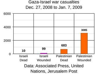 | Keywords: Gaza-Israel war casualties.svg en SVG version of Image Gaza-Israel_war_casualties png Created with Inkscape v0 46 and edited by hand by me Edit with a text editor to update dates / data Edit by amending negative vertical line shift for bar plots <ul> <li>Current multiplication factor for bar height is x0 05</li> <ul><li>e g for 179 the distance for the bar height is 8 95</li></ul> <li>e g for Israeli Wounded </li> <path id barIsraeliWounded d M 300 400 l 50 0 l 0 -17 9 l -50 0 z - Edit this number <li>also update numerical value above bar e g valueIsraeliWounded </li> <ul><li>may need to adjust height of this text as well</li></ul> <li>Also update data for date s titleLine2 </li> </ul> Current data sources Associated Press United Nations Jerusalem Post are listed below Numbers in the chart for the wounded are for those with physical injuries The numbers in the chart do not include those who have only been psychologically injured or traumatized Associated Press http //www guardian co uk/world/feedarticle/8201821 Jan 6 2009 article Ten Israelis have died since the operation began United Nations http //www ochaopt org http //www ochaopt org/documents/ocha_opt_gaza_situation_report_2009_01_05_english pdf Jan 5 2009 report Overall close to 60 IDF soldiers have been wounded in Gaza since Saturday Jan 3 2009 http //www ochaopt org/documents/ocha_opt_gaza_humanitarian_situation_report_2009_01_07_english pdf Jan 7 2009 report Every other person in Gaza is a child 56 percent of the population and they remain dangerously exposed to the fighting around them At least 101 children have been killed almost one thousand injured and tens of thousands traumatized According to the MoH the total number of casualties as of 1400 hours today has risen to at least 683 Palestinians killed and more than 3 085 injured since 27 December Jerusalem Post Jan 6 2009 article titled Rocket slams into Ashdod kindergarten discusses casualties caused by rockets http //fr jpost com/servlet/Satellite cid 1231167267556 pagename JPost/JPArticle/ShowFull Four Israelis have been killed 10 moderately to seriously wounded and 29 slightly wounded Another 144 have been treated for shock Image Gaza-Israel_war_casualties png Gringer <span class signature-talk >talk</span> 02 08 8 January 2009 UTC 2009-08-01 Image Gaza-Israel_war_casualties png Casualty statistics of the 2008-2009 Gaza War |