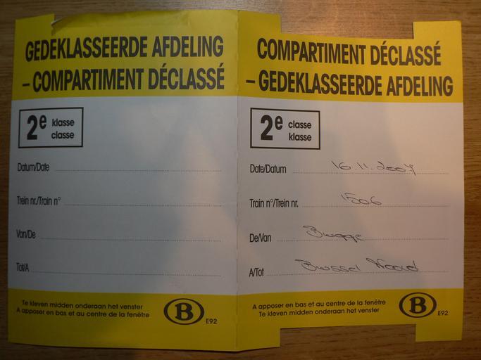 | Keywords: Gedeklasseerde afdeling NMBS.jpg compartment reduced in traveller's class 1st to 2nd class usually because of lack of 2nd class space in the train sometimes only during rush hours in the surroundings of Brussels Own Zwager Text French/Dutch <pre> COMPARTIMENT DECLASSE - GEDEKLASSEERDE AFDELING 2e classe / klasse Date/Datum 16 11 2007 Train n°/Trein nr 1506 De/Van Brugge A/Tot Brussel Noord A apposer en bas et au centre de la fenĂȘtre Te kleven midden onderaan het venster B E92 </pre> Translation <pre> DECLASSIFIED COMPARTMENT 2nd class Date 16 11 2007 Train number 1506 From Brugge Till Brussel Noord Put this in the lower middle of the window B E92 </pre> B is the symbol of the NMBS/SNCB the national Belgian railways Rail transport in Belgium |