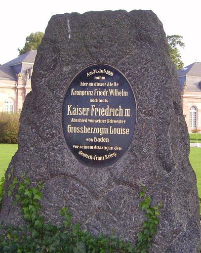 Keywords: Gedenkstein Friedrich Wilhelm Schloss Schwetzingen.JPG Gedenkstein für Kronprinz Friedrich Wilhelm von Preußen den späteren Kaiser Friedrich III im Schwetzinger Schlossgarten own own photography Immanuel Giel 2006-09-25 ImageNote 1 315 325 450 608 1088 1369 2 <center>Am 31 Juli 1870<br>nahm<br>hier an dieser Stelle<br><big>Kronprinz Friedr Wilhelm</big><br>nachmals<br><big><big>Kaiser Friedrich III </big></big><br>Abschied von seiner Schwester<br><big>Grossherzogin Louise</big><br>von Baden<br>vor seinem Auszug in den<br>deutsch-franz Krieg <center> ImageNoteEnd 1 Memorial stones Monuments and memorials in Schwetzingen Schlossgarten Schwetzingen Monuments and memorials to Friedrich III Princess Louise of Prussia 31 July |