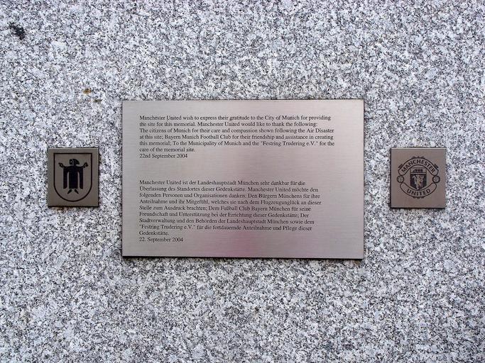 | Keywords: Gedenkstein Manchester United Inschrift.jpg en Tablet bearing the inscription at the memorial stone in remembrance of the Munich air disaster 06 Februrary 1958 de Texttafel am Gedenkstein zum Flugzeugabsturz am 06 Februar 1958 own Flo Sorg 2009-06-01 48 7 33 02 N 11 40 36 55 E type landmark_region DE_heading WNW Munich air disaster memorial Plaques in Munich |