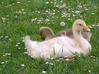Keywords: geese daisies meadow yellow blossom bloom white