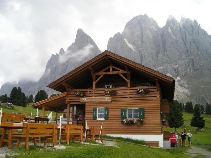 Keywords: geisleralm hut adolf munkel off geisler range val gardena dolomites mountain hut cloudiness mountains alpine south tyrol italy
