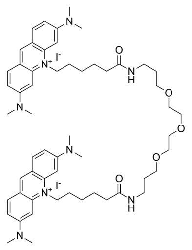 Keywords: GelGreen chemical structure.png Chemical structure of GelGreen a DNA staining dye for gel electrophoresis own original text Selfmade 1 2012-11-20 Cacycle GFDL-self-no-disclaimers review Comments High-resolution black/white PNG made with ChemDraw and IrfanView ” see WikiProject Chemistry - structure drawing for detailed instructions Please drop me a note if you need the source file Structure taken from patent http //worldwide espacenet com/searchResults compact false ST number locale en_EP DB EPODOC NUM US20100323453 US20100323453 where it is referred to as Dye No 20 and AOAO-13 The compound was identified by comparison of the gel image in Fig 8 C with the identical image in this http //www biotium com/product/product_info/flyer/GelRed 20 20GelGreen 20Flyer pdf product info Acridines Dyes Images created or edited with IrfanView |