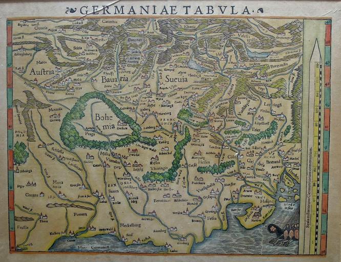 | Keywords: Gemaniae-Tabula-(Sebastian-Muenster).jpg en A Map of Germany Germaniae Tabula printed at Basel in 1540 by Sebastian Münster for his Cosmography Cosmographie from a woodcut An extra-Ptolemaic map facing south de Germaniae Tabula Basel 1540 von Sebastian Münster Cosmographie Holzschnittkarte Die Karte ist noch nicht žgenordet d h Süden ist oben und Norden ist unten Das war zu dieser Zeit die übliche Darstellung Ptolomaeus-Ausgabe BMK 1540 <gallery> File Cosmographia Sebastian Münster p 060 jpg 1545 version </gallery> PD-100 Sebastian Münster Maps in Latin Maps in German 1540 maps Ptolemaic Germany 1540 Extra-Ptolemaic maps |