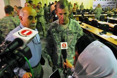 | Keywords: Gen. Stanley A. McCrystal is interviewed by local media (4522471005).jpg 100415-N-6031Q-006 KABUL Afghanistan “ Gen Stanley A McCrystal is interviewed by local media during a break at the two day quarterly Corps Commander Conference and Security Shura held on April 13th and 14th 2010 at the ANAAC base in Kabul Afghanistan Ministry of Defense Abdul Rahim Wardak Deputy Minister of the Interior Lt Gen Munir Mangal as well as all of the senior Afghan National Security Force leaders attended the conference The Purpose of the conference was to evaluate the security stability and development of Afghanistan US Navy photo by Mass Communication Specialist 2nd Class David Quillen/ RELEASED http //www flickr com/photos/ntm-a_cstc-a/4522471005/ 100413-N-6031Q-006A JPG Uploaded by russavia 2010-04-13 10 48 http //www flickr com/people/44825691 N08 NATO Training Mission-Afghanistan MC2 David Quillen/Public Affairs KAIA Attribution-ShareAlike License IPTC Caption-Abstract US Navy photo PD-USGov-Military-Navy File Upload Bot Magnus Manske 2013-07-13 Files from NATO Training Mission-Afghanistan Flickr stream Afghanistan photos from Flickr check needed NATO Training Mission - Afghanistan Stanley A McChrystal |