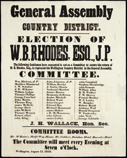 | Keywords: text writing monochrome Arrangement of text. Lists Rhodes' backers as follows: Wm Hickson, Matthew Hammond, C W Schultze, J W M'Kaine, William Galpin, Thomas Phillips, George Crawford, John Martin, Thomas Ring, James McBeth, George Buck, John McBeth, Thomas Morgan, Robert Jillett, John King, John Johnston, William Bowler, J Smith (Ohariu), Nathaniel Bartlett, James Barnes, Benjamin Jefferson, James Mitchell, Robert Waitt, John Glasgow, Edward Roe, Richard Hammond, James Hallett, J D McMannaway, John Gibson, James Calder, John Campbell, Stephen Stockbridge, John Symons, William Allen, R D Wallace, P M Hervey, Francis Bradey, W S Loxley, W Bromley, Robert Bould, Anthony Wall, Donald Ferguson, W Tankersley, John Nicol, George Edwards. Honorary secretary J H Wallace. Committee rooms at Mr M'Kaine's, Half-Way House, Mr Calder's, Rainbow Hotel, Barrett's Hotel. Some of the letter J type is in lower case. Quantity: 1 b&w art print(s). Physical Description: Letterpress on paper, 750 x 605 mm. General Assembly, Country district. Election of W. B. Rhodes, esq., J.P. The following gentlemen have consented to act as a committee to secure the return of W B Rhodes, esq, to represent the Wellington Country District in the General Assembly. ... Wellington, August 11, 1853.. Ref: Eph-E-POLITICS-1853-01. Alexander Turnbull Library, Wellington, New Zealand. natlib.govt.nz/records/22434044 Arrangement of text. Lists Rhodes' backers as follows: Wm Hickson, Matthew Hammond, C W Schultze, J W M'Kaine, William Galpin, Thomas Phillips, George Crawford, John Martin, Thomas Ring, James McBeth, George Buck, John McBeth, Thomas Morgan, Robert Jillett, John King, John Johnston, William Bowler, J Smith (Ohariu), Nathaniel Bartlett, James Barnes, Benjamin Jefferson, James Mitchell, Robert Waitt, John Glasgow, Edward Roe, Richard Hammond, James Hallett, J D McMannaway, John Gibson, James Calder, John Campbell, Stephen Stockbridge, John Symons, William Allen, R D Wallace, P M Hervey, Francis Bradey, W S Loxley, W Bromley, Robert Bould, Anthony Wall, Donald Ferguson, W Tankersley, John Nicol, George Edwards. Honorary secretary J H Wallace. Committee rooms at Mr M'Kaine's, Half-Way House, Mr Calder's, Rainbow Hotel, Barrett's Hotel. Some of the letter J type is in lower case. Quantity: 1 b&w art print(s). Physical Description: Letterpress on paper, 750 x 605 mm. General Assembly, Country district. Election of W. B. Rhodes, esq., J.P. The following gentlemen have consented to act as a committee to secure the return of W B Rhodes, esq, to represent the Wellington Country District in the General Assembly. ... Wellington, August 11, 1853.. Ref: Eph-E-POLITICS-1853-01. Alexander Turnbull Library, Wellington, New Zealand. natlib.govt.nz/records/22434044 |
