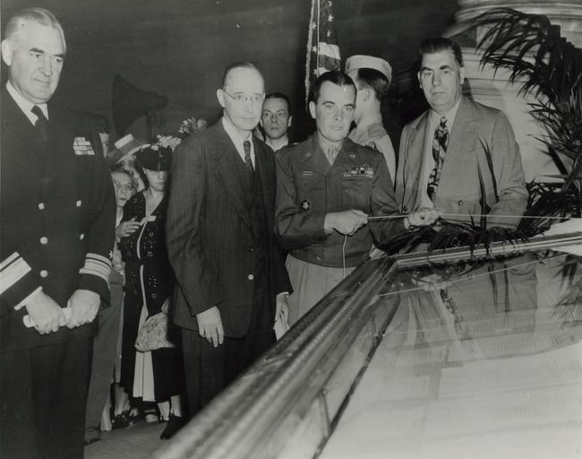 Keywords: united states national archives personnel unitedstatesnationalarchivespersonnel nara:arcid=4477175 germany germany surrender germanysurrender world war ii worldwarii u.s. national archives usnationalarchives b/w bw Original Caption: General McAuliffe unveiling the German Surrender Documents in the Rotunda of the National Archives, June 6, 1945. U.S. National Archives’ Local Identifier: 64-NA-426 Subjects: United States National Archives Personnel Persistent URL: catalog.archives.gov/id/4477175 Repository: Still Picture Records Section, Special Media Archives Services Division (NWCS-S), National Archives at College Park, 8601 Adelphi Road, College Park, MD, 20740-6001. For information about ordering reproductions of photographs held by the Still Picture Unit, visit: www.archives.gov/research/order/still-pictures.html Reproductions may be ordered via an independent vendor. NARA maintains a list of vendors at www.archives.gov/research/order/vendors-photos-maps-dc.html Access Restrictions: Unrestricted Use Restrictions: Unrestricted Original Caption: General McAuliffe unveiling the German Surrender Documents in the Rotunda of the National Archives, June 6, 1945. U.S. National Archives’ Local Identifier: 64-NA-426 Subjects: United States National Archives Personnel Persistent URL: catalog.archives.gov/id/4477175 Repository: Still Picture Records Section, Special Media Archives Services Division (NWCS-S), National Archives at College Park, 8601 Adelphi Road, College Park, MD, 20740-6001. For information about ordering reproductions of photographs held by the Still Picture Unit, visit: www.archives.gov/research/order/still-pictures.html Reproductions may be ordered via an independent vendor. NARA maintains a list of vendors at www.archives.gov/research/order/vendors-photos-maps-dc.html Access Restrictions: Unrestricted Use Restrictions: Unrestricted |