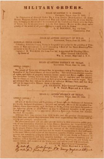 Keywords: history slavery emancipation holiday juneteenth text document monochrome "The people of Texas are informed that, in accordance with a proclamation from the Executive of the United States, all slaves are free. This involves an absolute equality of personal rights and rights of property, between former masters and slaves and the connection heretofore existing between them, becomes that between employer and hired labor. The Freedmen are advised to remain at their present homes and work for wages. They are informed that they will not be allowed to collect at military posts; and they will not be supported in idleness either there or elsewhere." — Wikipedia (accessed 19 June 2016). ***************** "Juneteenth falls on June 19 each year. It marks what is arguably the most significant event in American history after independence itself—the eradication of American slavery. For centuries, slavery was the dark stain on America’s soul, the deep contradiction to the nation’s founding ideals of “Life, liberty and the pursuit of happiness” and “All men are created equal.” When Abraham Lincoln issued the Emancipation Proclamation on January 1, 1863, he took a huge step toward erasing that stain. [The Emancipation Proclamation declared all slaves to be freed in the Confederate States of America in rebellion and not in Union hands. Lincoln urged the governments in the border states, which had remained in the Union, to free their slaves under a system of gradual abolition but none did so.] The full force of Lincoln's proclamation would not be realized until June 19, 1865—Juneteenth, as it was called by slaves in Texas freed that day. The westernmost of the Confederate states, Texas did not get news of Gen. Robert E. Lee’s surrender at Appomatox that April until two months after the fact. But they heard once Union Gen. Gordon Granger, a New Yorker and West Point graduate with a distinguished wartime service record, arrived in Galveston Bay with more than 2,000 Union troops. It was on June 19 that he publicly read General Order No. 3, which began: “The people of Texas are informed that, in accordance with a proclamation from the Executive of the United States, all slaves are free.” — Smithsonian Magazine (accessed 19 June 2016). "The people of Texas are informed that, in accordance with a proclamation from the Executive of the United States, all slaves are free. This involves an absolute equality of personal rights and rights of property, between former masters and slaves and the connection heretofore existing between them, becomes that between employer and hired labor. The Freedmen are advised to remain at their present homes and work for wages. They are informed that they will not be allowed to collect at military posts; and they will not be supported in idleness either there or elsewhere." — Wikipedia (accessed 19 June 2016). ***************** "Juneteenth falls on June 19 each year. It marks what is arguably the most significant event in American history after independence itself—the eradication of American slavery. For centuries, slavery was the dark stain on America’s soul, the deep contradiction to the nation’s founding ideals of “Life, liberty and the pursuit of happiness” and “All men are created equal.” When Abraham Lincoln issued the Emancipation Proclamation on January 1, 1863, he took a huge step toward erasing that stain. [The Emancipation Proclamation declared all slaves to be freed in the Confederate States of America in rebellion and not in Union hands. Lincoln urged the governments in the border states, which had remained in the Union, to free their slaves under a system of gradual abolition but none did so.] The full force of Lincoln's proclamation would not be realized until June 19, 1865—Juneteenth, as it was called by slaves in Texas freed that day. The westernmost of the Confederate states, Texas did not get news of Gen. Robert E. Lee’s surrender at Appomatox that April until two months after the fact. But they heard once Union Gen. Gordon Granger, a New Yorker and West Point graduate with a distinguished wartime service record, arrived in Galveston Bay with more than 2,000 Union troops. It was on June 19 that he publicly read General Order No. 3, which began: “The people of Texas are informed that, in accordance with a proclamation from the Executive of the United States, all slaves are free.” — Smithsonian Magazine (accessed 19 June 2016). |