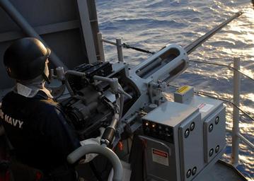 Keywords: General quarters drill aboard USS Peleliu DVIDS101162.jpg en Petty Officer 2nd Class Adrian Lopez gunner's mate mans a 25mm gun aboard the amphibious assault ship USS Peleliu during a general quarters drill Peleliu is in the Pacific Ocean on a scheduled deployment 2008-05-08 Petty Officer 2nd Class Sarah Bitter https //www dvidshub net/image/101162 080508-N-+++++-013 2008-07-08 04 49 USPACOM AT SEA PD-USGov-Military-Navy USS Peleliu LHA-5 Images from DoD uploaded by Fæ |
