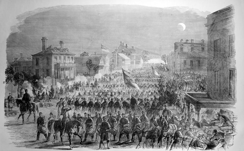 | Keywords: blackandwhite monochrome outdoor snow black and white General Stevens's brigade occupied Beaufort, S. C., on the evening of December 5th, 1861. It was a most brilliant and suggestive scene. The moon—just at the half—shone with splendor, reminding one of that beautiful passage in Homer which represents the orb of night rising merely to shed a glory upon the Grecian arms. At the end of the street the river flowed in silence and light. Here and there the streets were dotted with bivouac fires, around which arms were stacked and soldiers lounging. (from Frank Leslie's Illustrated History of the Civil War..., edited by Louis Shepheard Moat, Published by Mrs. Frank Leslie, New York, 1895) General Stevens's brigade occupied Beaufort, S. C., on the evening of December 5th, 1861. It was a most brilliant and suggestive scene. The moon—just at the half—shone with splendor, reminding one of that beautiful passage in Homer which represents the orb of night rising merely to shed a glory upon the Grecian arms. At the end of the street the river flowed in silence and light. Here and there the streets were dotted with bivouac fires, around which arms were stacked and soldiers lounging. (from Frank Leslie's Illustrated History of the Civil War..., edited by Louis Shepheard Moat, Published by Mrs. Frank Leslie, New York, 1895) |