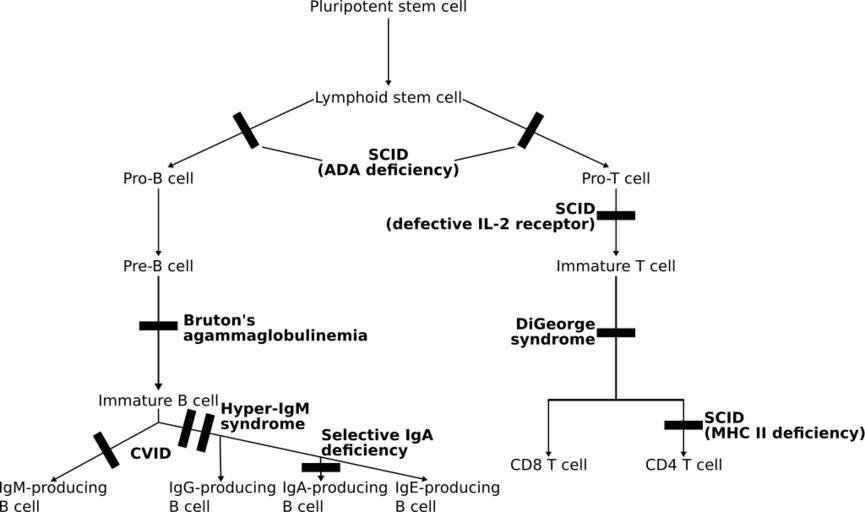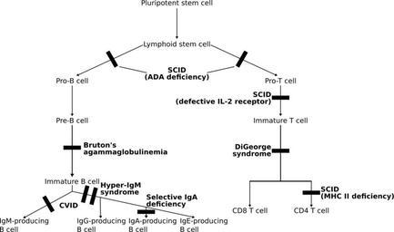 | Keywords: Genetic Immunodeficiencies.svg en Chart showing locations of malfunction leading to common errors of lymphocyte development My own work based upon information presented in 2009 First Aid for the USMLE Step 1 own Huckfinne 2009-12-07 Immunodeficiency Lymphocytes |