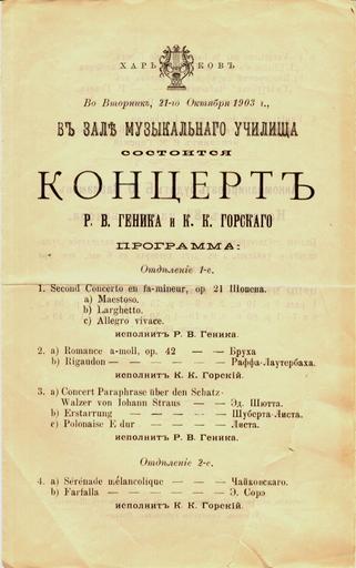 | Keywords: Genika end Gorski.jpg ru Афиша конце та п еподавателей Ха ьковского музыкального училища ИР О пианиста и музыкального к итика Ростислава Геники и ск ипача и композито а Константина Го ского состоявшегося 21 октяб я 1903 года в Ха ькове в Зале Ха ьковского музыкального училища ИР О own scan Ха ьковское музыкальное училище 1903-10-21 PD-Old Rostislav Genika Concert posters of Russia Documents of Kharkiv Kharkov posters 1903 concert posters | ||||