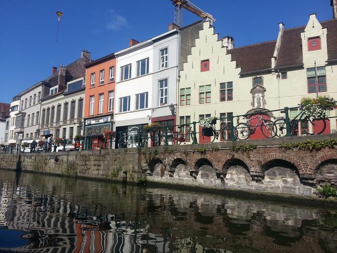 Keywords: gent belgium bank water channel historically romantic city view mirroring