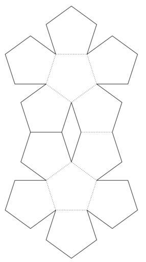 | Keywords: Geometric Net of a Regular Dodecahedron.svg en A geometric net of a regular dodecahedron This polyhedron has 12 faces each of which are identical pentagons Created with GeoGebra 2013-10-23 23 01 06 own DEMcAdams cc-zero Geometric Net Dodecahedron |