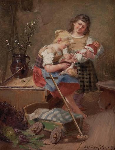 Keywords: Georg Rössler Zwei Mädchen mit Puppen 1894.jpg Zwei Mädchen mit Puppen unten rechts signiert und datiert Gg Roessler 18 94 Öl auf Holz ca 28 x 19 cm http //www dorotheum com/ Dorotheum 1894 Georg Rössler 1861-1925 PD-old Images from Dorotheum Georg Rössler 1894 paintings Portraits of girls with dolls Playing children in art |