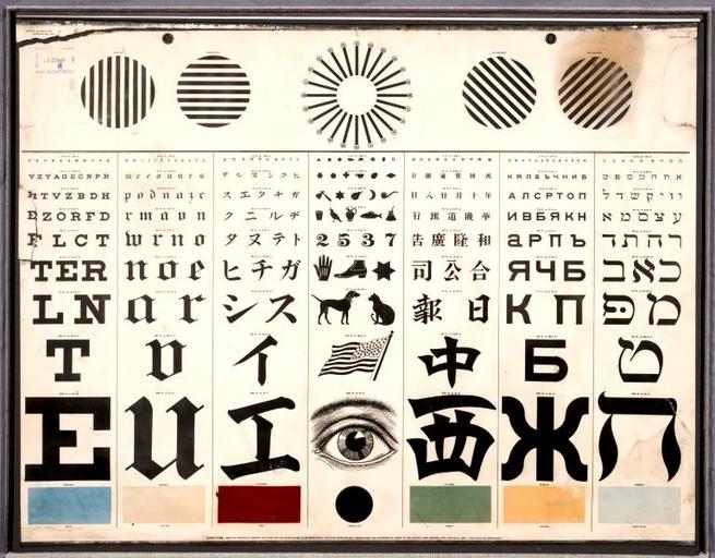| Keywords: George Mayerle test chart..JPG en Double-sided a positive image of the test chart appears on one side a negative image on the reverse This record is for the positive image The color boxes at the bottom of the chart are applied colored strips Mayerle ™s eye chart combined four subjective tests done during an eye examination Running through the middle of the chart the seven vertical panels test for acuity of vision with characters in the Roman alphabet for English German and other European readers and also in Japanese Chinese Russian and Hebrew A panel in the center replaces the alphabetic characters with symbols for children and adults who were illiterate or who could not read any of the other writing systems offered Directly above the center panel is a version of the radiant dial that tests for astigmatism On either side of that are lines that test the muscular strength of the eyes Finally across the bottom boxes test for color vision a feature intended especially according to one advertisement for those working on railroads and steamboats --NLM Hidden treasure 2013-09-25 12 26 24 Courtesy of the National Library of Medicine Images from the History of Medicine IHM http //ihm nlm nih gov/images/C06229 Also showcased in the book Hidden Treasure New York NY Blast Books 2012 p 136 HMD Prints Photos call number PP059701 map Mayerle George Custom license marker 2013 09 25 PD-USGov Uploaded with UploadWizard Eye charts |