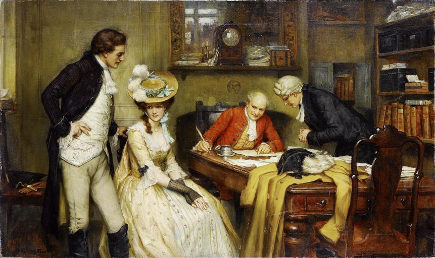 | Keywords: George Sheridan Knowles Signing the marriage contract 1905.jpg Signing the marriage contract Signed and dated G Sheridan Knowles/1905 Oil on canvas 61 x 101 6 cm http //www bonhams com/ Bonhams 1905 George Sheridan Knowles 1863-1921 PD-old Images from Bonhams Offices in art 1905 paintings Marriage contracts in art |