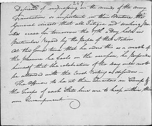 Keywords: u.s. national archives usnationalarchives today's document todaysdocument march march 16 march16 march 16, 1780 march161780 03/16/1780 03161780 nara:arcid=300356 geoge washington geogewashington st. patrick's day stpatricksday holiday order text blackandwhite writing monochrome document texture abstract black and white Title: George Washington's General Order of March 16, 1780, granting Saint Patrick's Day as a holiday to the troops., 03/16/1780 - 03/16/1780 Production Date: March 16, 1780 George Washington's General Order of March 16, 1780, granting Saint Patrick's Day as a holiday to the troops., 03/16/1780 (ARC ID 300356); Numbered Record Books, 1894 - 1913; War Department Collection of Revolutionary War Records, 1709 - 1915; Record Group 93, National Archives. Persistent URL: arcweb.archives.gov/arc/action/ExternalIdSearch?id=300356 Access Restrictions: Unrestricted Use Restrictions: Unrestricted Title: George Washington's General Order of March 16, 1780, granting Saint Patrick's Day as a holiday to the troops., 03/16/1780 - 03/16/1780 Production Date: March 16, 1780 George Washington's General Order of March 16, 1780, granting Saint Patrick's Day as a holiday to the troops., 03/16/1780 (ARC ID 300356); Numbered Record Books, 1894 - 1913; War Department Collection of Revolutionary War Records, 1709 - 1915; Record Group 93, National Archives. Persistent URL: arcweb.archives.gov/arc/action/ExternalIdSearch?id=300356 Access Restrictions: Unrestricted Use Restrictions: Unrestricted |
