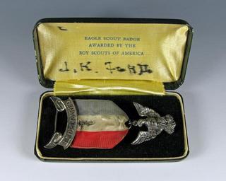| Keywords: Gerald Ford Eagle Scout medal.jpg en Eagle Scout award medal earned by Gerald R Ford in 1927 Features a metal eagle hanging from a red white and blue ribbon J R Ford written in black ink on back Complete with presentation box Gift of Gerald Ford Note More on Gerald R Ford ™s rank advancement in Boys Scouts of America at http //www lincoln-highway-museum org/GRF/GRF-01-Index html Lincoln Highway Museum 3 5 x 1 5 Institution Gerald R Ford Presidential Museum http //www fordlibrarymuseum gov/museum/ArtifactCollectionSamples/Catagories/LifeCareer/EagleScoutMedal html Eagle Scout medal accession number 1981 128 5 credit line Courtesy of the Gerald R Ford Presidential Museum Donation Date 1981 Institution Institution Gerald R Ford Presidential Museum Gerald R Ford Presidential Library and Museum-cooperation PD-USGov Uploaded with UploadWizard Miscellaneous objects in the collection of the Gerald R Ford Presidential Museum Boy Scouts of America Badges of the United States |