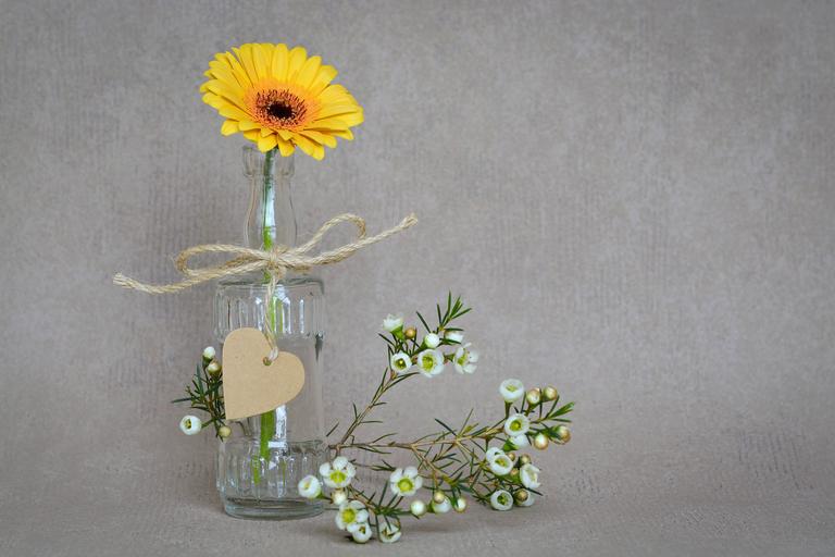 Keywords: gerbera flower blossom bloom yellow yellow flower schnittblume frangipani heart pendant vase deco still life close text freedom