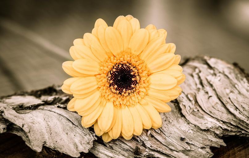 Keywords: gerbera yellow orange flower blossom bloom schnittblume wood close