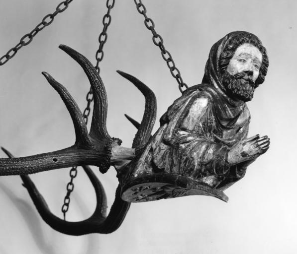 | Keywords: German - Chandelier - Walters 61309 - Detail A.jpg This bizarre creation originally had little candleholders attached to the antlers Chandeliers made from wooden half-figures with elk antlers attached at their backs called Lüstermännchen or Lüsterweibchen literally little chandelier man or woman were popular in Germany Even major artists such as Tilman Riemenschneider designed them They hung in town meeting halls inns hunting lodges and domestic spaces While the spreading forms of antlers may have suggested its use as a natural chandelier the addition of a half figure is the kind of hybrid creation that appealed to the medieval taste for fantasy Many of the existing chandeliers represent a woman holding a coat of arms with the antlers growing from her back The motif of a huntsman praying is unusual and may allude to the story of St Hubert a huntsman who came across a miraculous stag in the forest and fell on his knees before it in prayer ca 1500 Late Medieval wood with polychromy and elk horn cm 72 5 67 5 accession number 61 309 20434 William Randolph Hearst date and mode of acquisition unknown Blumka Gallery New York Mr and Mrs James O Anderson 1971 by purchase Walters Art Museum June 8 1971 by gift Gift of Mr and Mrs James O Anderson 1971 World of Wonder The Walters Art Gallery Baltimore 1971-1972 place of origin south Germany Walters Art Museum license Antler furniture Cervus canadensis antlers Furniture in the United States Medieval art in the Walters Art Museum Renaissance applied arts in the Walters Art Museum German art in the Walters Art Museum Media contributed by the Walters Art Museum needs category review |