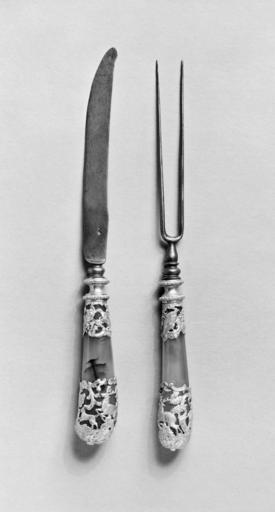 Keywords: German - Knife and Fork with Leather Case - Walters 57990.jpg Because cutlery was not common during the 18th century wealthy travelers frequently carried their own sets with them This particularly elegant set has agate handles mounted with openwork gold representing birds in scrolls and hunters with spears The fitted leather case with tooled leather may predate the cutlery and be of French origin middle Other date century 18 iron gold agate leather knife cm 18 73 ; fork cm 18 42 accession number 57 990 19071 Leon Gruel Paris Henry Walters Baltimore date of acquisition unknown by purchase Walters Art Museum Henry Walters Acquired by Henry Walters place of origin Germany Walters Art Museum license German art in the Walters Art Museum Media contributed by the Walters Art Museum needs category review |