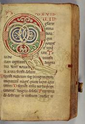 Keywords: German - Leaf from Claricia Psalter - Walters W2664R - Open Obverse.jpg The figure of a woman swinging diagonally over the page forms the tail of the letter Q that begins Psalm 51 in the counting of the Vulgata today Psalm 52 Quid gloriaris in malicia qui potens es in iniquitate Why do you boast of malice ; a name Claricia is inscribed above her head late Other date century 12 Medieval ink gouache parchment cm 22 9 14 8 accession number W 26 64R 25823 Made for a nunnery in southern Germany probably Saints Ulrich and Afra in Augsburg Ulrich and Afra mentioned in calendar and are probably depicted on fol 131v 13th-14th-century charter now fol 189r refers to Stephanus Sancti Eusebii presbiter dilecte Richardo vecturi prochialis vcche in guewibeke ends with reference to dominus pontifex libinus pb anno septimo Bénigne-Charles Févret de Saint-Mémin 1770-1852 bookplate on front pastedown now removed date and mode of acquisition unknown Zeisberg Sale Wernigerode October 10 1854 no 37 Price Stolberg-Wernigerode 1854 by purchase no Za51 on spine G Schar G Schar 20 on fol 1r date and mode of acquisition unknown Gruel date and mode of acquisition unknown Henry Walters Baltimore date and mode of acquisition unknown Walters Art Museum Henry Walters Acquired by Henry Walters Illuminated Manuscripts Masterpieces in Miniature The Walters Art Gallery Baltimore 1984-1985 Schatzkammer Henry Walters' German Manuscripts The Walters Art Museum Baltimore 2006 place of origin Augsburg Germany Walters Art Museum license 3D Claricia Psalm 52 Q as an initial Walters MS W26 - Claricia Psalter Psalm 51 |