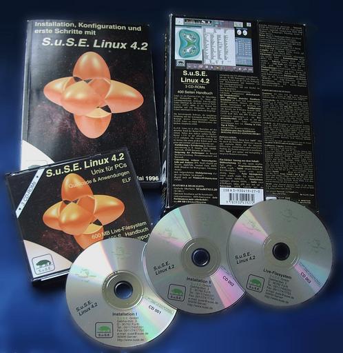 Keywords: German SuSE Linux 4.2 Box Manual and CDs.jpg SuSE Linux 4 2 Box with Manual and 3 CD-ROMs; 5th edition 1996 Photo taken by myself with Pentax Optio S40 / edited with The GIMP Dirk Meyer 2005-05-29 Category Computing Taken with Pentax Optio S40 SuSE |