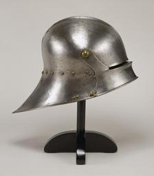 | Keywords: German - Visoreal Sallet - Walters 51470 - Profile.jpg A work of art and a triumph of technology the long-tailed sallet was the characteristic German war helmet of the later Middle Ages This is a superb example The flowing profile of the neck defense and mirror-like polish of the hammered tempered steel could deflect the most formidable blows The visor could be raised to provide better vision and easier breathing It would have been used with a chin guard Its weight at 4 lbs 12 oz is considerably less than that of its Italian counterpart This sallet is from the Princes of Liechtenstein collection at Vaduz between 1480 1490 Renaissance steel iron cm 25 5 22 5 39 6 accession number 51 470 497 Liechtenstein Sale American Art Association New York November 19 1926 no 232 Henry Walters Baltimore 1926 mode of acquisition unknown Walters Art Museum Henry Walters Acquired by Henry Walters 1926 World of Wonder The Walters Art Gallery Baltimore 1971-1972 Highlights from the Collection The Walters Art Gallery Baltimore 1998-2001 place of origin Germany Walters Art Museum license Renaissance applied arts in the Walters Art Museum Armour in the Walters Art Museum Armour of Germany German art in the Walters Art Museum 15th-century helmets Sallets |