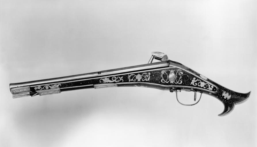 Keywords: German - Wheellock pistol with inlaid grotesque masks - Walters 51441.jpg The proportions and balance of this pistol including the fishtail butt curving around the hand are visually pleasing and also make this 3 lb 5 3 oz gun easier to handle The relative crudeness of the manufacture including the inlaid decoration taken from a pattern book indicates that the pistol was made for a cavalryman as opposed to an aristocratic officer There are two marks stamped on the pistol the maker's mark which although found on other guns has not been identified; and the control mark on the barrel indicating that it has been inspected for quality in Nuremberg between 1575 1590 steel or iron wood walnut bone or antler and engraved mother-of-pearl inlay; parts replaced L cm 57 accession number 51 441 2093 Thewalt Sale Cologne 1903 no 1697 Henry Griffith Keasbey New York date and mode of acquisition unknown Sale American Art Association New York December 5 1924 no 139 Henry Walters city Baltimore Walters Art Museum Henry Walters Acquired by Henry Walters 1924 place of origin Nuremberg Germany Walters Art Museum license Baroque art in the Walters Art Museum Weapons in the Walters Art Museum German art in the Walters Art Museum Weapons of Germany Wheellock pistols |