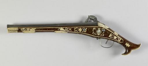 Keywords: German - Wheellock pistol with inlaid grotesque masks - Walters 51441 - Side A.jpg The proportions and balance of this pistol including the fishtail butt curving around the hand are visually pleasing and also make this 3 lb 5 3 oz gun easier to handle The relative crudeness of the manufacture including the inlaid decoration taken from a pattern book indicates that the pistol was made for a cavalryman as opposed to an aristocratic officer There are two marks stamped on the pistol the maker's mark which although found on other guns has not been identified; and the control mark on the barrel indicating that it has been inspected for quality in Nuremberg between 1575 1590 steel or iron wood walnut bone or antler and engraved mother-of-pearl inlay; parts replaced cm 57 accession number 51 441 2093 Thewalt Sale Cologne 1903 no 1697 Henry Griffith Keasbey New York date and mode of acquisition unknown Sale American Art Association New York December 5 1924 no 139 Henry Walters city Baltimore Walters Art Museum Henry Walters Acquired by Henry Walters 1924 place of origin Nuremberg Germany Walters Art Museum license Baroque art in the Walters Art Museum Weapons in the Walters Art Museum German art in the Walters Art Museum Weapons of Germany Wheellock pistols Engraved weapons |