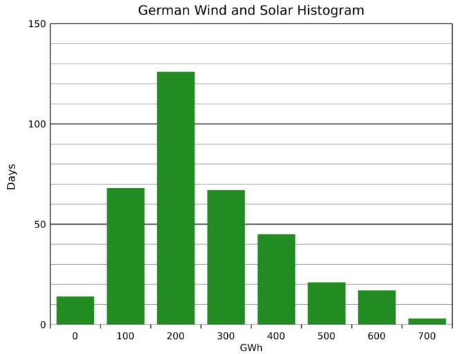 Keywords: German Wind and Solar Generation Histogram.svg translate yes en Histogram showing the number of days that wind power and solar power in Germany combined to provide a given range of generation during 2015 On one day in January and one in March total generation from wind and solar was between 25 and 45 GWh and on three days the total was over 700 GWh providing over half of Germany's electricity Data source https //transparency entsoe eu/generation/r2/actualGenerationPerProductionType/show entsoe 2016-05-07 own Delphi234 other versions cc-zero Wind energy statistics of Germany Photovoltaic power statistics of Germany Histograms |