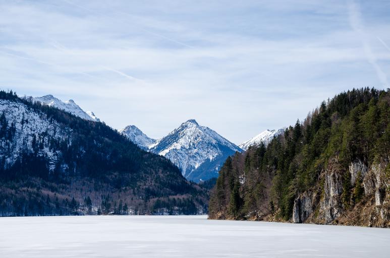 Keywords: germany bavaria schwangau idyllic winter allgäu ostallgäu sky lake mountains panorama landscape nature alpsee forest trees
