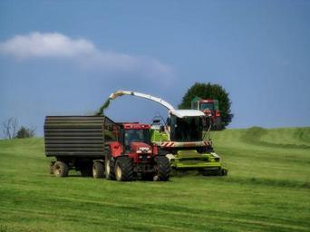 Keywords: germany landscape scenic farm combine tractor wagon loading field crop harvest sky clouds rural country countryside nature outside outdoors farm work